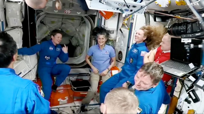 विल्मोर ने रविवार को अंतरिक्ष स्टेशन का ‘हैच’ खोला और इसके बाद एक के बाद एक चारों नए यात्री अंदर आए। अंतरिक्ष में पहले से मौजूद अंतरिक्ष यात्रियों ने अपने नए साथियों का स्वागत उनसे गले मिलकर और हाथ मिलाकर किया। विलियम्स ने ‘मिशन कंट्रोल’ से कहा, “यह एक शानदार दिन था। अपने दोस्तों को यहां देखकर बहुत खुशी हुई।